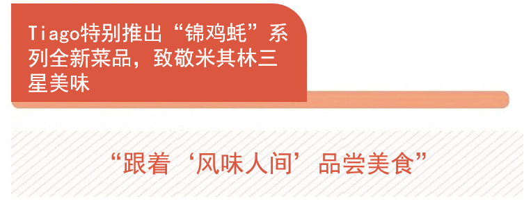 近日,Tiago为了满足食客们的好奇心,特别推出“神鸡驾到”锦鸡蚝系列全新菜品,包括锦鸡蚝牡蛎浓汤、香煎鹅肝配5J火腿松露黄鸡卷、法式香浓奶黄鸡,以及锦鸡蚝凯撒沙拉。目前,锦鸡蚝新品套餐已在CASA TALIA侨福芳草地店开售,想要尝鲜的人们不妨周末开启一段专属于锦鸡蚝的美味之旅。