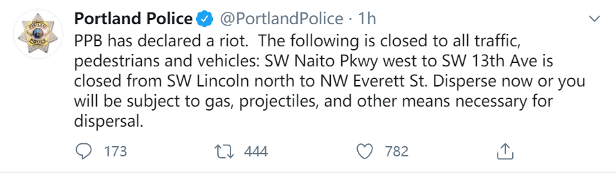警方的推文中写道:“现在就散开,否则您将被烟雾弹、爆破弹和其他必要手段驱散。”