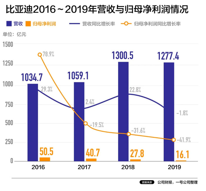 数据显示,2019年,比亚迪全年营收1277.39亿元,同比下降1.78%;归属于上市公司股东的净利润16.12亿元,同比下降42.03%。