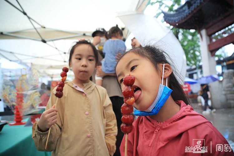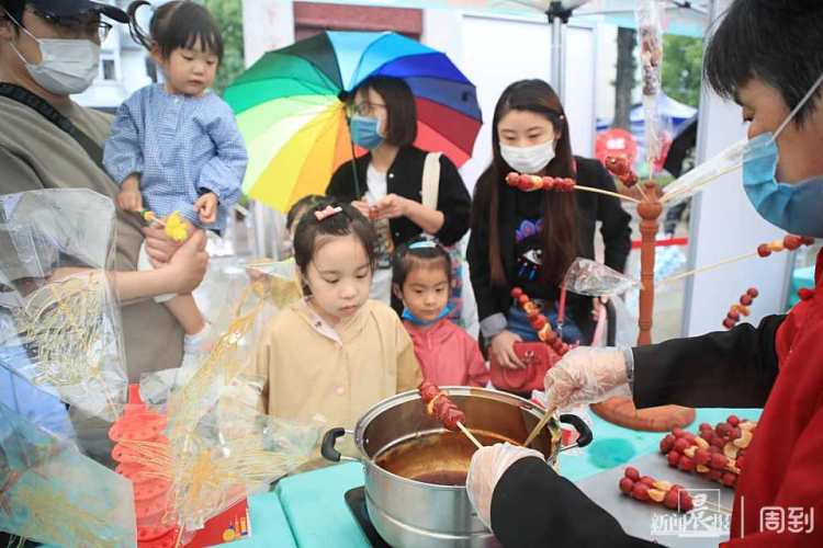 刚走近糖葫芦和糖画摊位,记者就闻到了浓郁的麦芽糖香味。火红的山楂、用细竹签儿串成一串,再裹上甜丝丝的麦芽糖浆,酸甜可口的冰糖葫芦就制作完成了!浓郁的香味吸引了不少小朋友前来品尝。