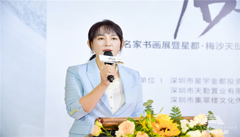随着展会开启,星宇金都投资集团副董事长兼总经理黄昕珮女士讲述本次举办名家书画艺术展的初衷,希望以中国传统书画艺术盛会的形式,溯源中华文脉,以中国传统书画之美,开启关于生活艺术的探索与体验。旨在用传统文化与前沿审美碰撞,发现隐匿于生活的艺术美学,品味生活本来的美好。将星都·梅沙天邸融合天赋山海、东方文化、滨海美学、品质人居的建筑理念呈现给大家。