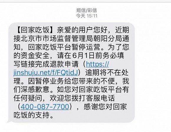今日,有「回家吃饭」用户陆续收到平台官方发送来的暂停运营通知。短信显示,"近期接到北京市市场监督管理局朝阳分局通知,回家吃饭暂停运营,为了您的资金安全,请您在6月1日钱进入链接完成退款申请。"