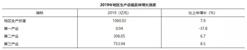 其中:第一产业实现增加值0.04亿元,下降37.8%;第二产业实现增加值306.0亿元,增长6.7%;第三产业实现增加值753.9亿元,增长8.5%。按常住人口计算,人均生产总值110778元,增长7.1%。