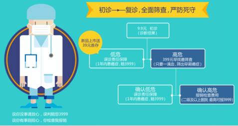 如果判别患癌风险低,泰康提供3999元误诊责任保障,即客户如在1年内患癌症,则赔付3999元误诊责任金。如果判别患癌风险高,则免费提供一个“早找癌”筛查,可检测出15种常见癌症,如最终判断患癌风险低,则仍然提供3999元误诊责任保障。