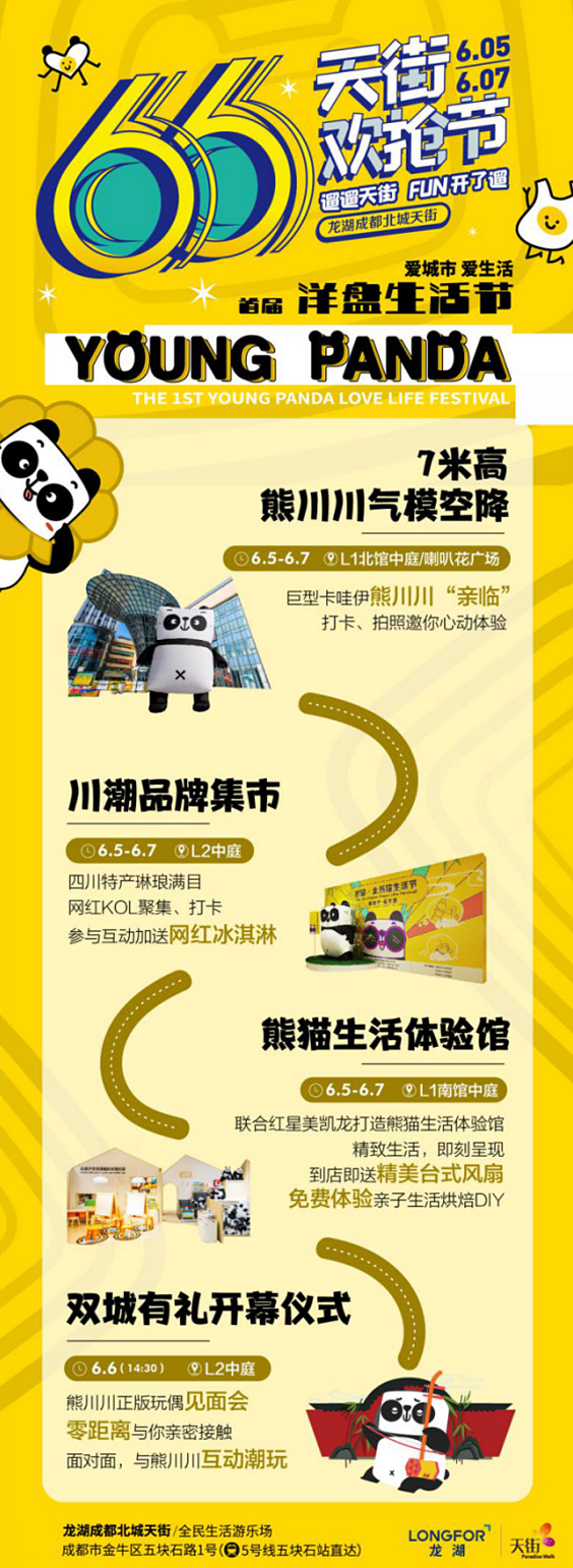 6月5日-6月7日龙湖成都北城天街联合四川电视台,举办“爱城市 爱生活”首届YOUNG PANDA洋盘生活节。7米巨型熊川川气模“亲临”,打卡、拍照邀你心动体验;川潮品牌集市同步亮相,四川特产琳琅满目,网红KOL聚集、打卡,参与互动加送网红冰淇淋;熊猫生活体验馆,联合红星美凯龙精致打造,到店即可免费体验亲子生活烘焙DIY。而6.6当天,双城有礼开幕仪式将启动,熊川川正版玩偶见面会登陆,零距离与你接触,面对面,互动潮玩!