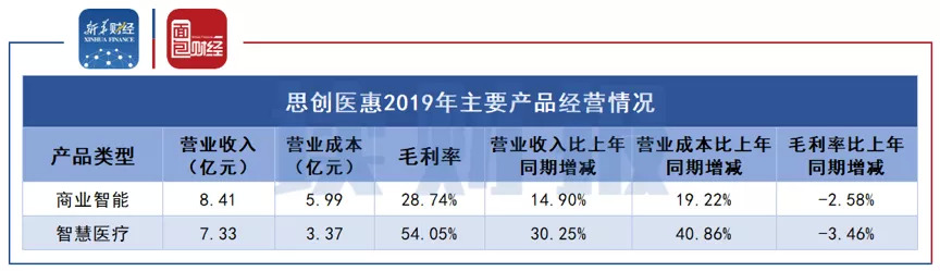 根据年报,公司2019年商业智能产品的营业收入同比增长14.9%,营业成本同比增长19.22%,毛利率同比下滑2.58个百分点;智慧医疗产品的营业收入同比增长30.25%,营业成本同比增长40.86%,毛利率同比下滑3.46个百分点。