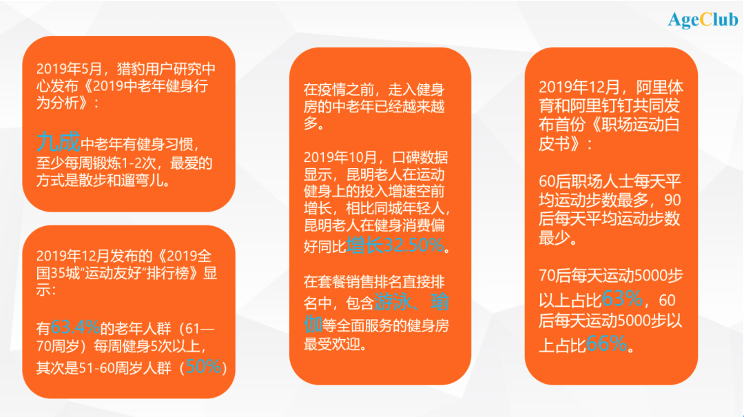 目前我国健身行业已然“触底”,即将“反弹”。AgeClub认为,在全民健身总体趋势之下,中老年群体的专业健身需求需要被进一步挖掘和释放,这背后蕴藏很大的商业潜力。