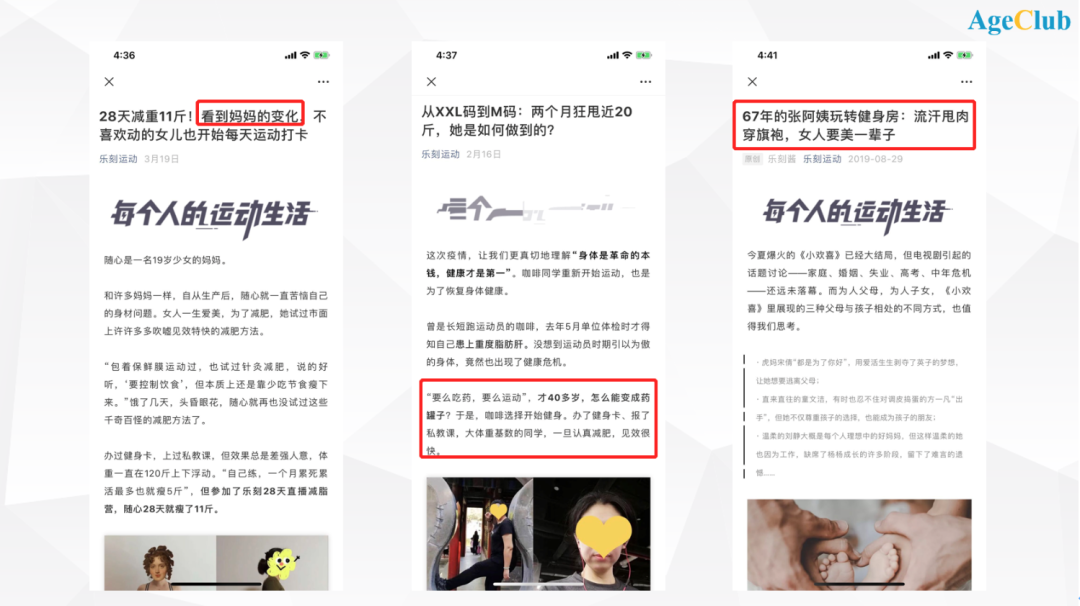 在乐刻的官方微信公众号推送中,也不乏专门针对中老年需求、传播积极正能量的内容。