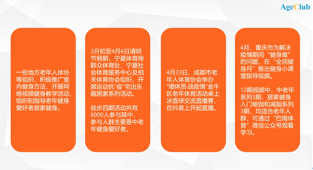 此外,各官方组织、老年组织、主流媒体,也在疫情期间更加重视老年健身方面的引导。