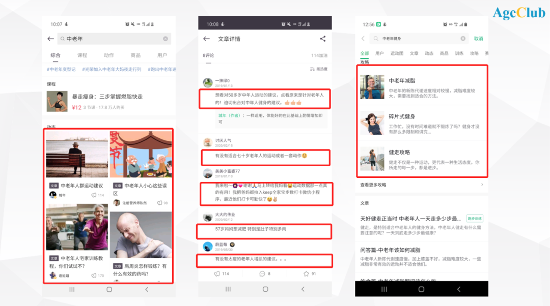在Keep、咕咚运动等运动健身类APP中搜索“中老年”,出来的话题、文章、动态等越来越多,中老年健身需求显著。