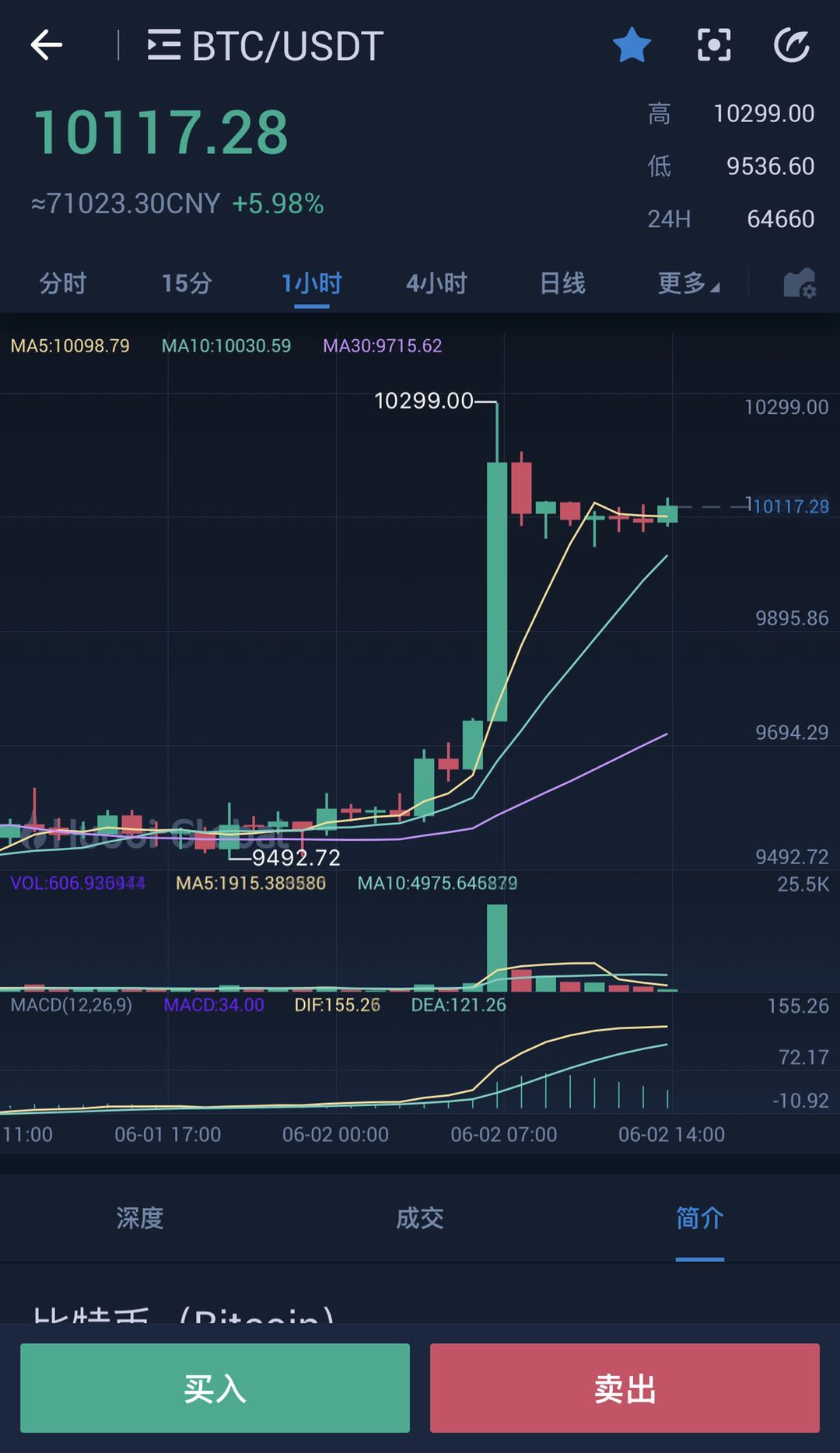 6月2日7时,比特币突破1万美元,最高涨至近10300美元,创2020年2月16日以来新高。截止界面新闻发稿之际,比特币暂时回落至10110附近,24h涨幅近6%。