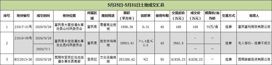 上周,包含富民县在内,本地共有3宗土地挂牌到期,1宗土地因无人报价而流拍,另外2宗均成功交易。交易总面积约439亩,成交总价约4.2亿元。