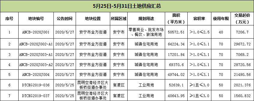 其中,5宗位于安宁市金方街道面积约377亩的居住及商服用地,交易起价约9.4亿元,住宅起始楼面价约1326~1490元/㎡。