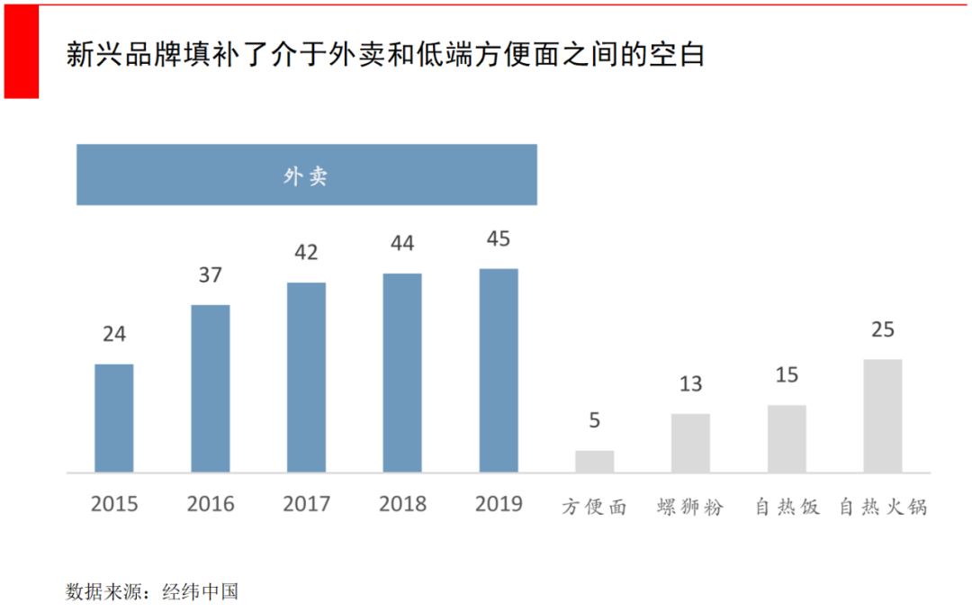 在快速的生活节奏下,人们一直需要“又快又好地吃一餐饭”,传统方便面相对于外卖缺陷明显,在外卖失去补贴的性价比优势后,介于原来的3-5元低端方便面,和40元以上外卖市场之间的市场空白就出现了。