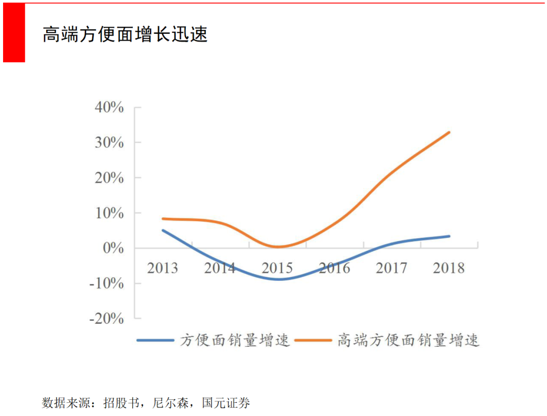 即便在方便面销量大幅下滑之际,高端方便面也一直保持正向增长。例如在香港市场占比60%的日清食品,拥有“出前一丁”等日式高端方便面产品,在大陆一直保持正向的增长,2019年复苏后还实现了12%的同比增长,这说明整个方便食品市场出现了分歧。
