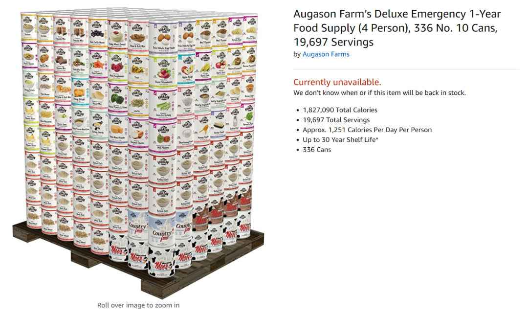 Augason Farm's供4人一年的“末日罐头”,欧洲和美国的生存主义者(survivalism)群体在支持着这一市场,他们随时为自然灾难做准备