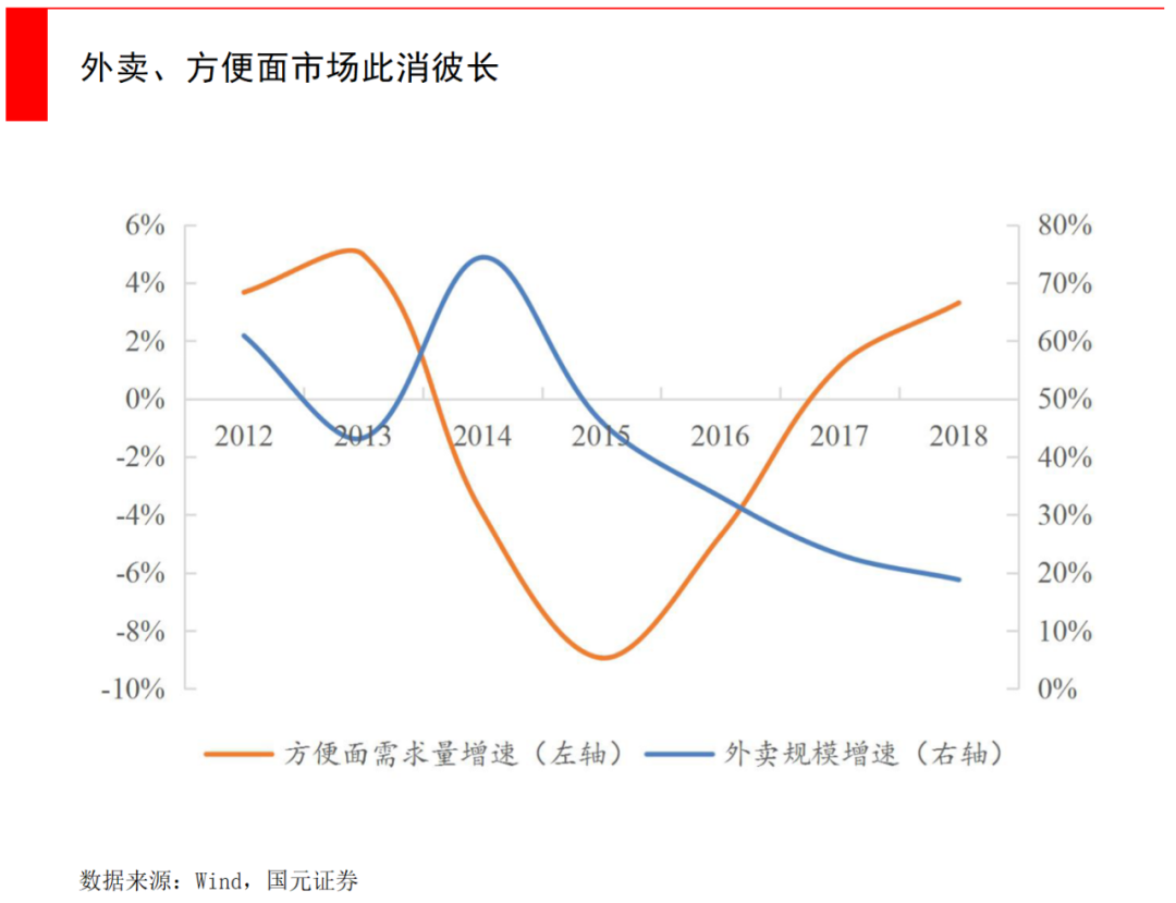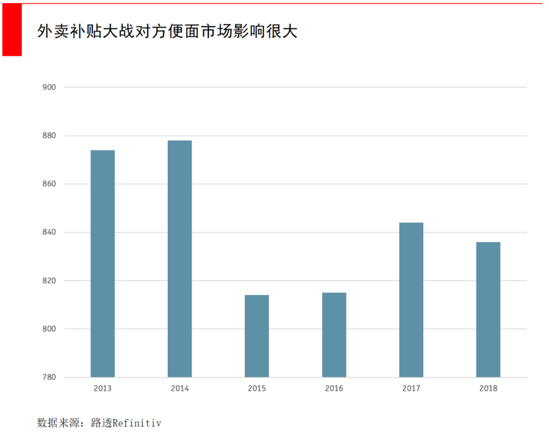 不过这一市场也是受外卖崛起影响最大的。从2013年开始,方便食品便节节败退,在外卖补贴大战最凶猛的2015年和2016年,更是下滑到了谷底,当时饿了么、美团外卖和百度外卖互相攻伐,市场增量抢夺的都是原来方便食品的市场。