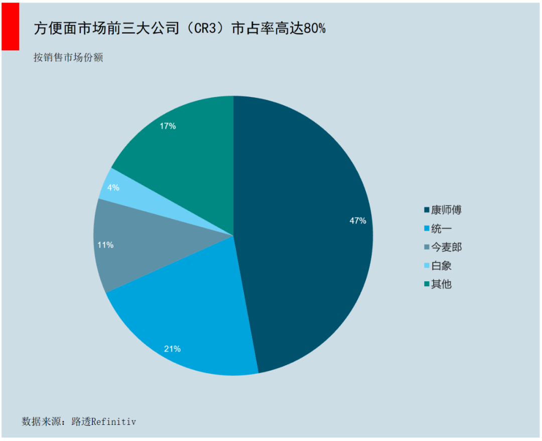 方便食品的一大特点是——市场集中度非常高。例如在方便面市场中,第一名康师傅占据了47%的市场份额(按销售额),第二名统一占据了21%,第三名今麦郎占据了11%,前三名的公司已经占据了整个市场的80%。
