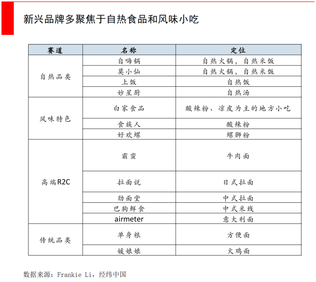 而近年来的新兴品牌,多聚焦于在产品或口味方面有所创新的自热食品和风味小吃: