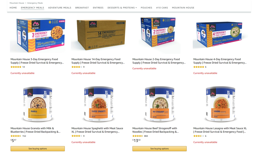 美国亚马逊上,Mountain House的应急食品大部分被抢购一空