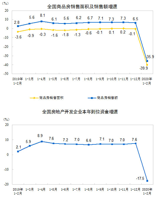 根据2020年全国房产销售数据统计,2020年1-2月,全国商品房销售面积与销售额双双大幅度跌落接近4成;房企的资金流回正速度也令人堪忧。