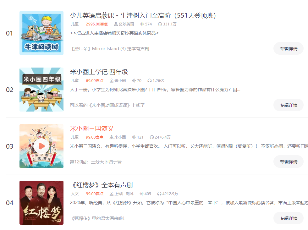 “螳螂财经”统计了下,在喜马拉雅Fm付费频道的前100名中,36%为儿童教育。前三名分别是《少儿英语启蒙课·牛津树入门至高阶(551天登顶班)》、《米小圈上学记·四年级》以及《米小圈三国演义》。