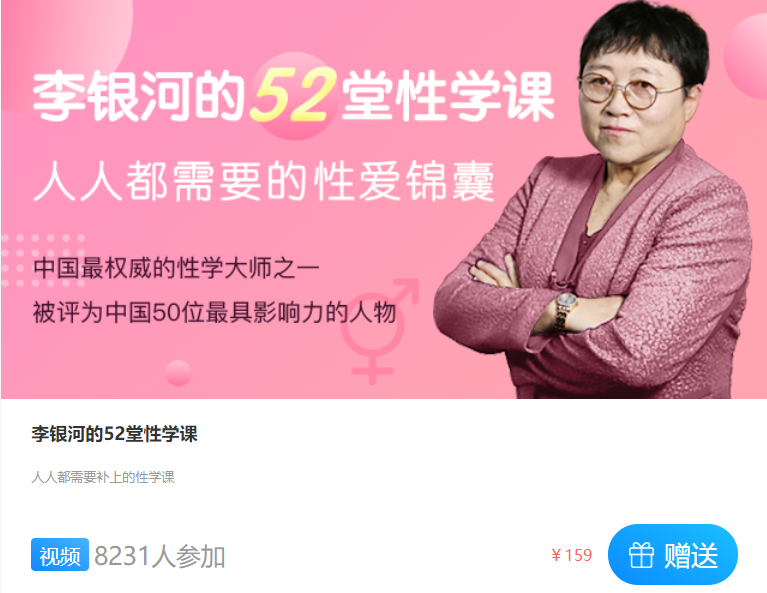 笔者曾在YouTube上看了《李银河52堂性学课》,内容非常精良用心,十分具备科普价值。然而几个月后,却在好几个公众号上看到了它的付费版,同样的内容,要价150元左右。当然,其内容绝对值得付费,但这种内外有别的做法,总让人心理不平衡。需要靠此获利的,与其说是手握版权的学者本人,不如说是平台机构。