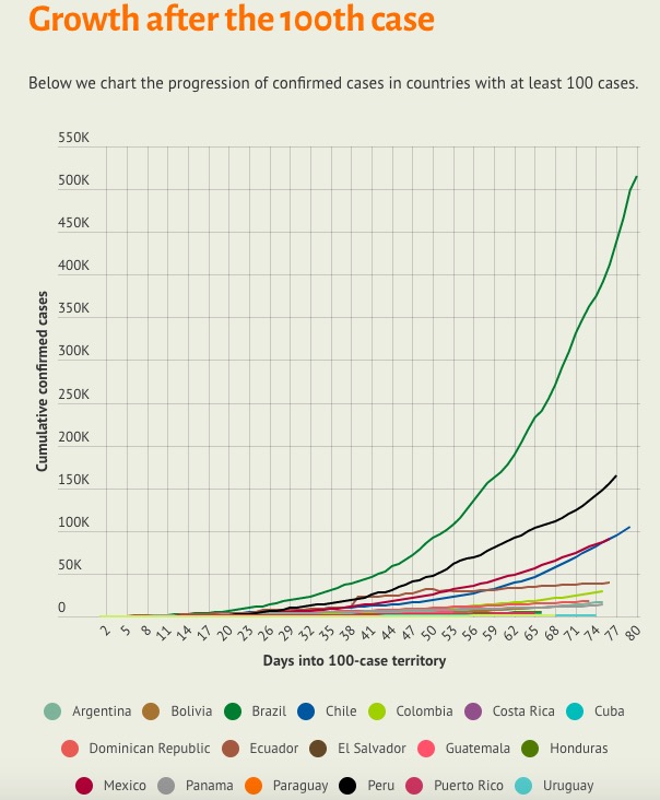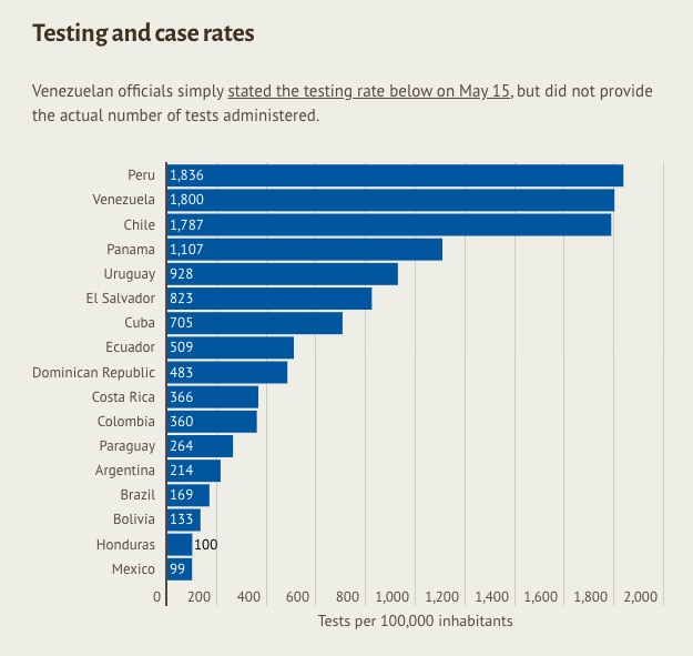 墨西哥卫生部副部长拉米瑞兹(Hugo Lopez-Gatell Ramirez)表示,墨西哥病例增速已经开始放缓,但有专家认为死亡人数在未来几周内仍会呈指数增长。墨西哥检测率在拉美国家中排名末位,每10万人仅有99人接受了病毒检测,批评人士称墨西哥政府一直在掩盖真实疫情规模。