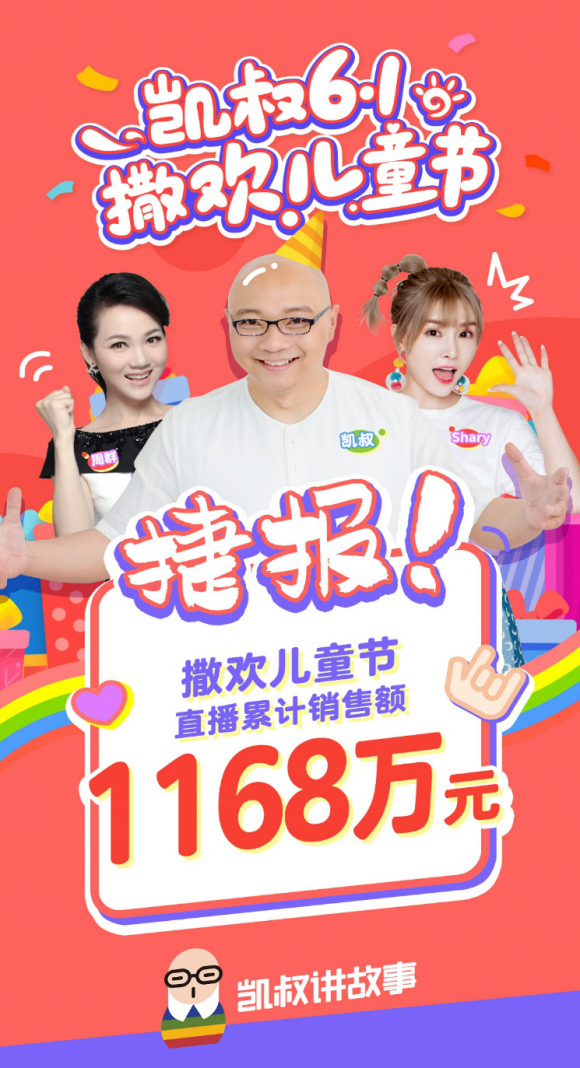 6月1日,深耕儿童教育内容的凯叔在“凯叔讲故事App”里开启了一场主题为“六一撒欢儿童节”的直播,在线3个多小时和和孩子们交流国学名著、科学故事知识,并送出价值超300万的涵盖吃、喝、玩、乐、学的“花样大礼包”,直播带货1168万元。