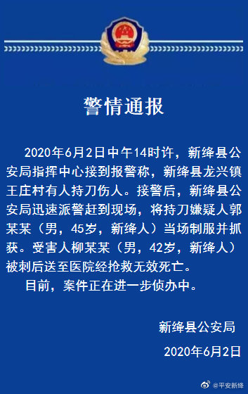 据山西省运城市新绛县公安局通报,2020年6月2日中午14时许,新绛县公安局指挥中心接到报警称,新绛县龙兴镇王庄村有人持刀伤人。接警后,新绛县公安局迅速派警赶到现场,将持刀嫌疑人郭某某(男,45岁,新绛人)当场制服并抓获。受害人柳某某(男,42岁,新绛人) 被刺后送至医院经抢救无效死亡。目前,案件正在进一步侦办中。