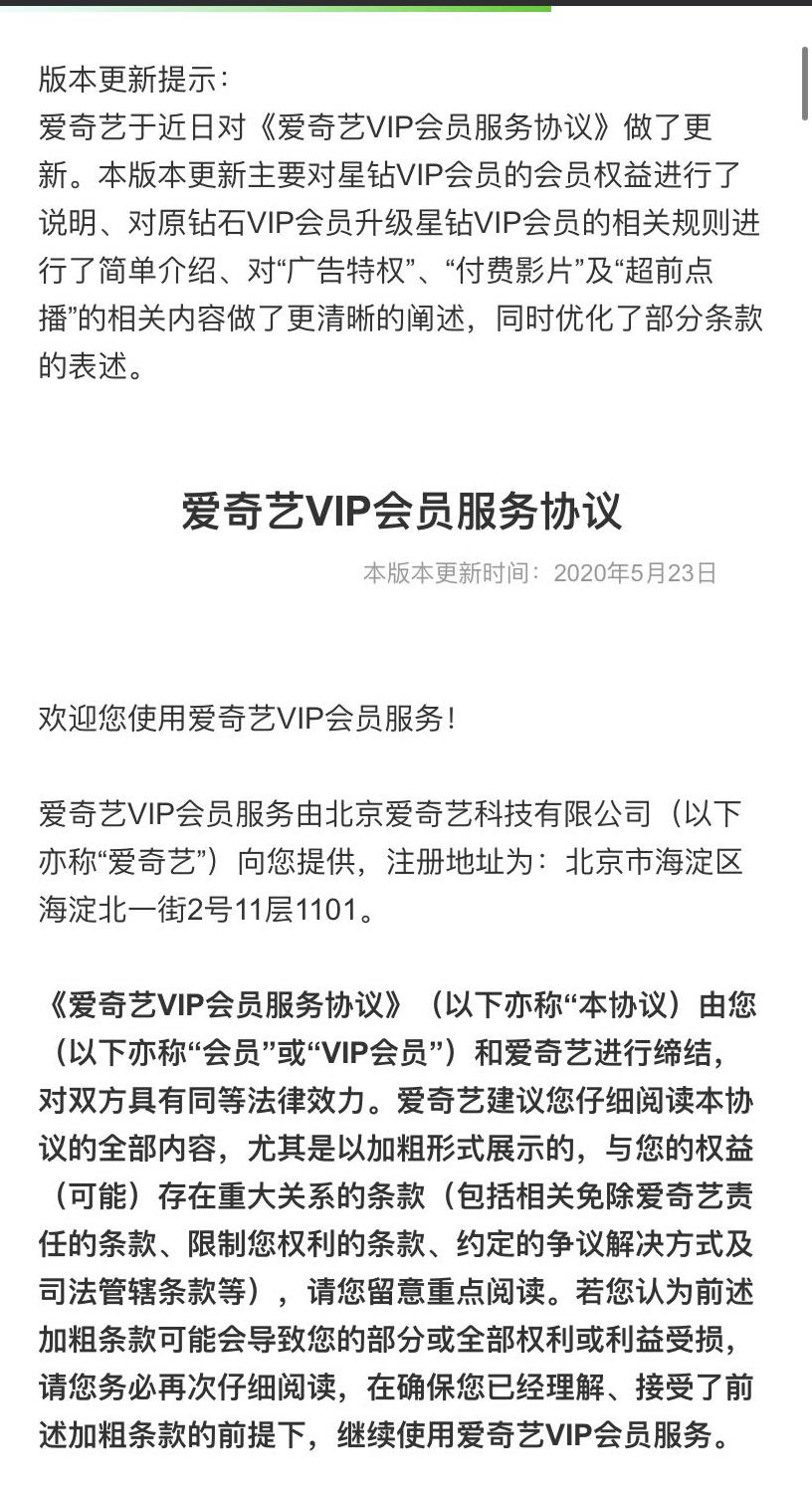 6月2日,北京互联网法院开庭审理了吴某诉爱奇艺公司网络服务合同纠纷一案,法院当庭宣判确认,《爱奇艺VIP会员服务协议》部分无效;在吴某购买会员服务后更新的“付费超前点播”条款对吴某不发生效力;爱奇艺公司继续向吴某提供原有会员权益。