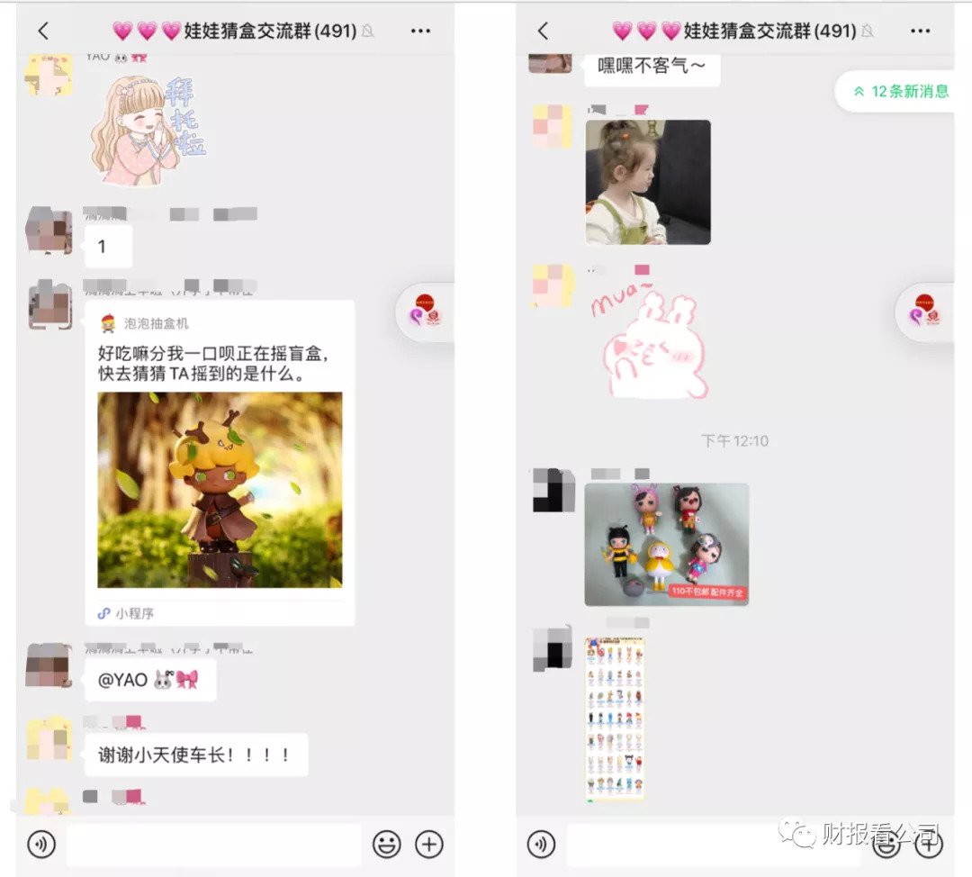 据《财报看公司》了解到,一般会有两种粉丝群。一种是店铺群,(泡泡玛特)店长拉群,一般会在里面说新品到货时间,可以在群里提前预定,娃友也可以交流,出二手;还有一种是粉丝自己拉的群,主要是二手买卖、交流,还有猜盒分享(Popmart小程序)。猜盒可以加幸运值,幸运值达到100可以用透视卡,直接告诉盒子里是什么东西。