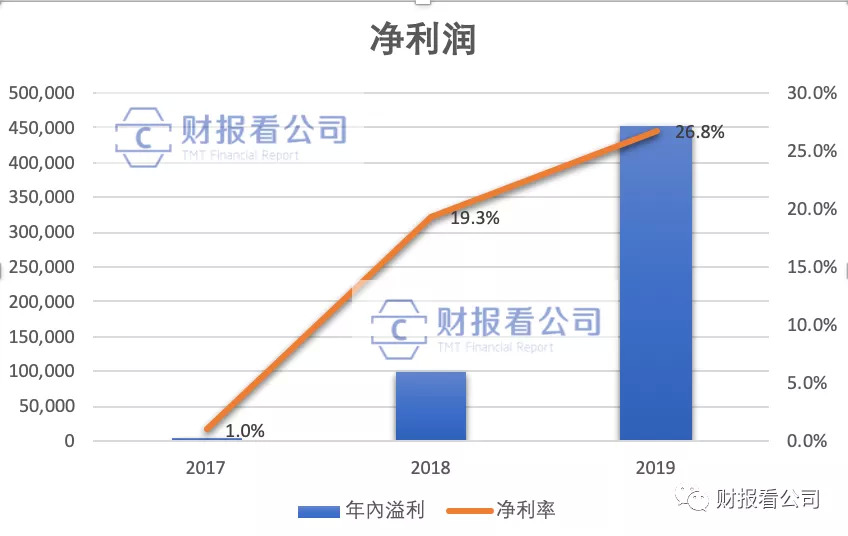 泡泡玛特2017年、2018年及2019年净利润160万元、9950万元及4.51亿元,净利率分别为1%、19.3%和26.8%。