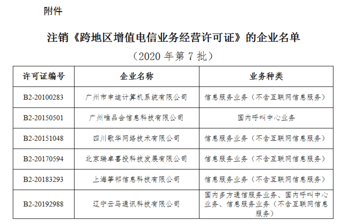 工信部官网6月3日消息,近期,广州市申迪计算机系统有限公司等6家企业向工业和信息化部申请终止经营相关增值电信业务。为维护电信用户合法权益,妥善解决用户善后问题,根据《电信业务经营许可管理办法》(工业和信息化部令第42号)规定,现公示拟注销跨地区增值电信业务经营许可的相关信息,公示期为自2020年6月3日起至2020年7月2日。在公示期内,对上述企业终止经营相关增值电信业务有异议或发现其存在遗留用户善后问题的,请向工业和信息化部反映相关情况,并提供详细凭证和联系方式,以便工业和信息化部调查处理。