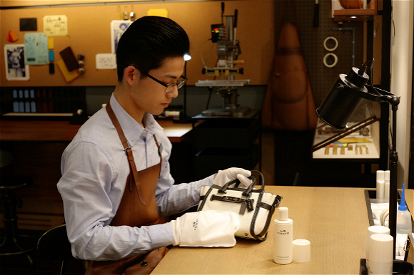 在高端奢侈品牌店常能看的驻场工匠,在Coach的上海香港广场店铺也能看到。进门一楼左手边是皮革服务专区,除了参观皮革和手工艺外,还可以请专家为皮革做清洁、保养,甚至在手袋上压印。