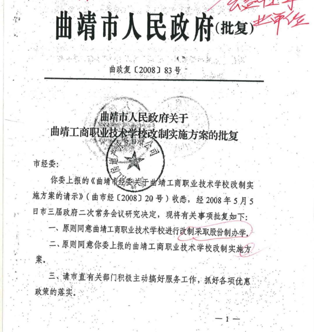 2008年6月5日,曲靖市政府批准了由曲靖市经委上报的《曲靖工商职业技术学校改制实施方案》(简称“改制方案”)。“改制方案”的股权结构部分载明:学校改制后是一所国家参股、民间资本控股、自然人入股的股份制学校。建设新校区总投资人民币2.2亿元,总股本为人民币1.7亿元。其中:国家股(曲靖市人民政府)人民币0.3亿元(以老校区评估处置后折现为准),占总股本的17.64%;企业股(曲靖江山房地产公司)人民币1.3亿元,占总股本76.47%;自然人股人民币0.1亿元,占总股本的5.88%。