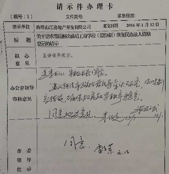 李红芬说,从2014年到2019年,李正魏重新准备材料,多次找相关部门争取学校“双登记”,曲靖市委市政府有关领导也作出多次批示,但批示之后再无下文。
