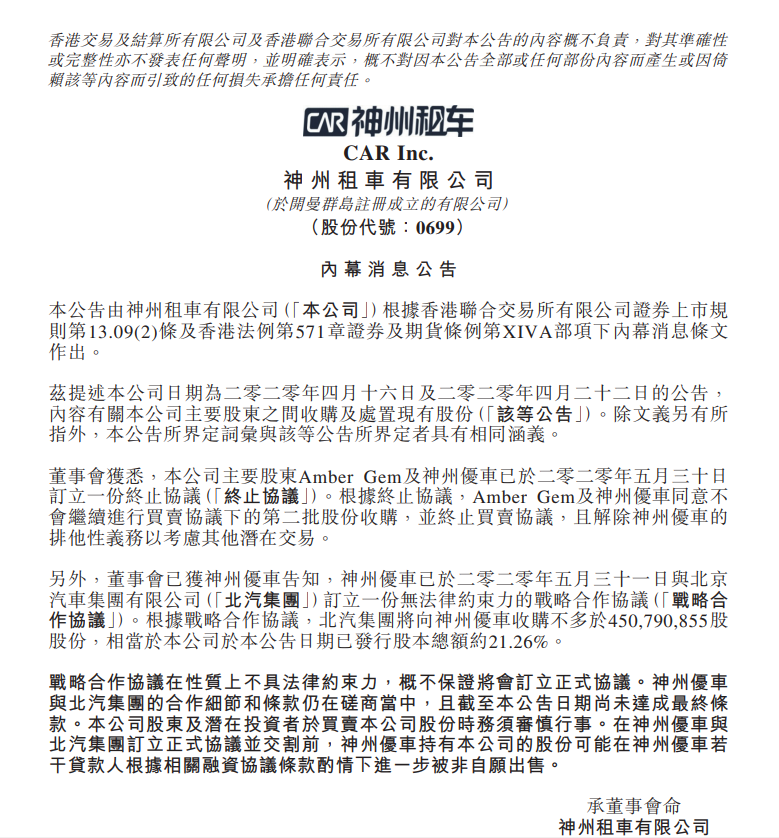 随后,神州租车等到了北汽集团的进场。6月1日发布的公告中,神州租车同时声明,Amber Gem“将不再继续进行买卖协议下的第二批股份收购,并终止买卖协议,且接触神州优车的排他性业务以考虑其他潜在交易”。这意味着,神州租车的“接盘侠”易主,从华平投资变成了北汽集团。
