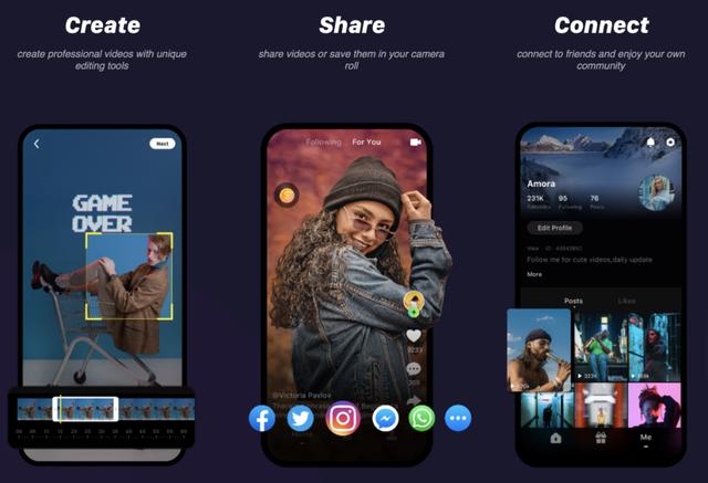 从产品直观感受来看,Zynn界面并不复杂,甚至颇有一股“TikTok风”。下载安装后进入主页面,视频自动播放、播放完成后自动重播,用户可通过上滑切换到下一条视频,也可通过点击和双击等操作来完成关注播主、进行点赞,并直接在App内进行短视频的拍摄、剪辑与加工制作,以及分享到Twitter、Facebook、Instagram等社交平台上,整体使用感上依旧是公众熟悉的交互感。