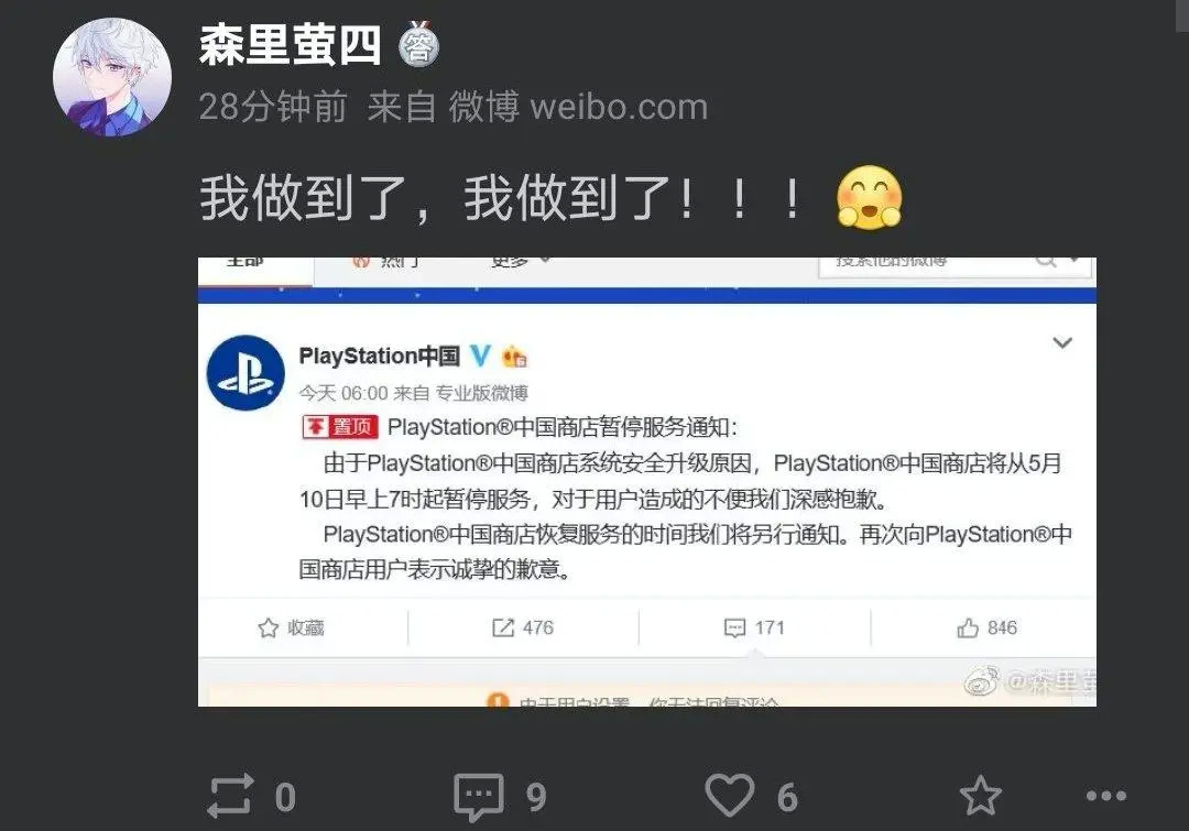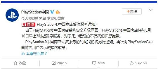 5月10日,Play Station中国在其官方微博中宣布,由于Play Station中国商店系统安全升级原因,将从5月10日早上7时起暂停服务,“Play Station中国商店恢复服务的时间我们将另行通知。”