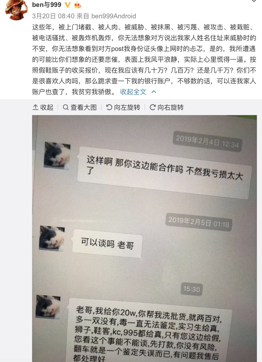 2019年,一位名为“AJ猛哥”的鉴定师爆出另一位知名鉴定师“ben”收钱给假鞋过鉴定。但随后,ben立即否认,并发出了与鞋贩子对话的截图。