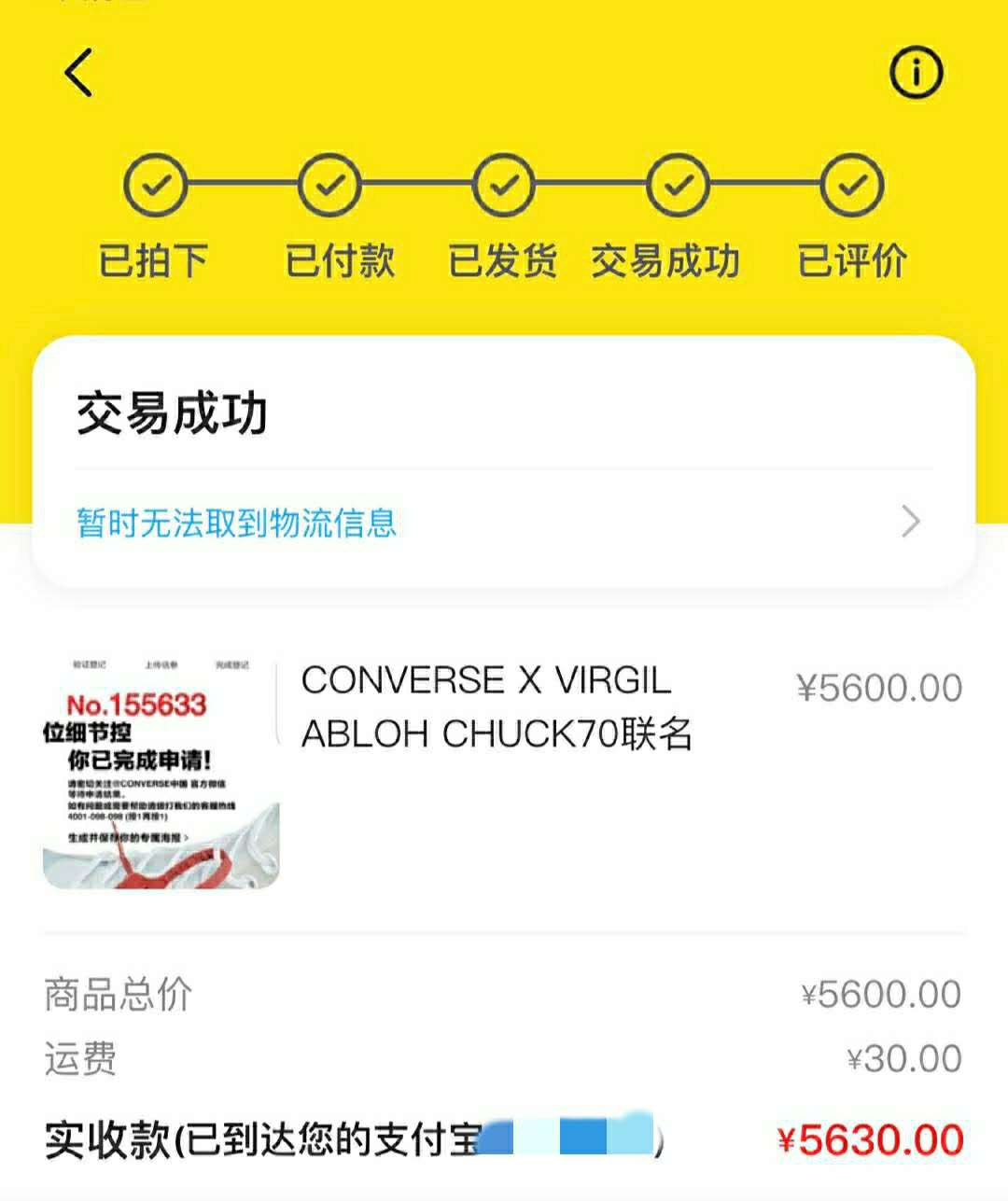 但只过了两个星期,由于生活费周转不开,加上担心鞋子砸在手里,小飞决定迅速脱手。很快,他挂在闲鱼上的鞋子就被一位上海买家拍下,成交价是5600元。而当初,小飞买进的价格仅为1099元,收益率高达410%。