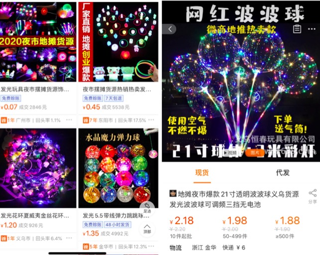 网红波波球也是地摊爆款商品之一,过去30天成交了10264件(一件500套)。但这家店的负责人称,相比较波波球,在他的店卖得最好的产品是荧光棒,这两天大部分都是新客户,通常几件几件地拿货,一件5000根,但这种聚少成多的小订单让他在阿里巴巴平台销量增加了200%,此外,他于义乌购平台的订单也有所增加。