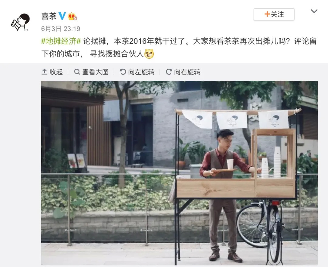 喜茶创始人聂云辰,昨天在朋友圈转发了喜茶官方微博的图片,“论摆摊,本茶2016年就干过了”。