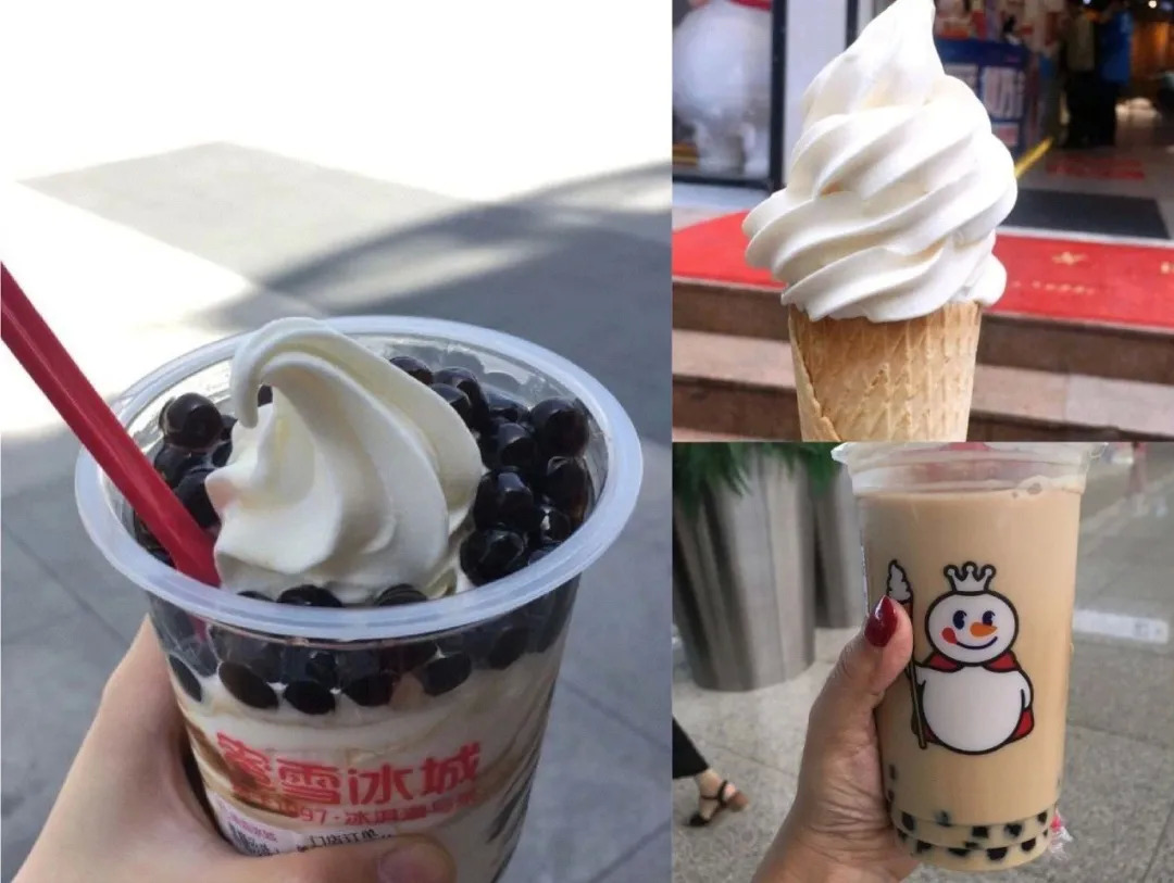 蜜雪冰城的黑糖珍珠大圣代、冰淇淋、珍珠奶茶,图片来自大众点评