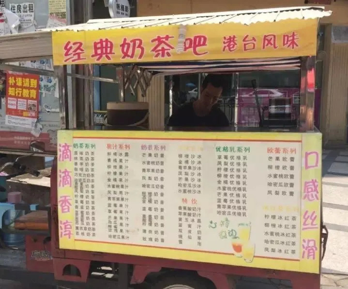 对很多消费者来说,第一杯奶茶,就来自学校门口的三轮奶茶车,2块一杯,口味丰富。