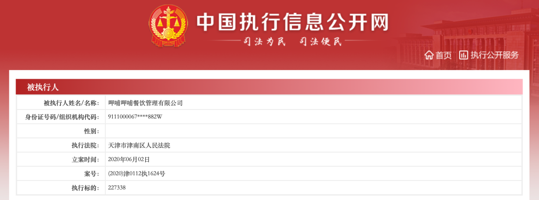 信息显示,呷哺呷哺的执行标的为227338,执行法院为天津市津南区人民法院,案号为(2020)津0112执1624号。