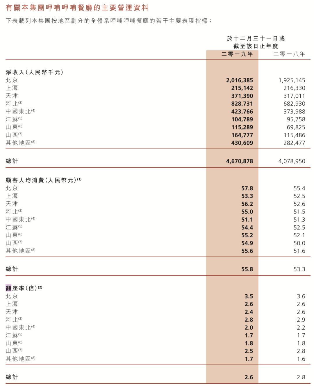 值得注意的是,在大举扩张的背后,全国呷哺呷哺餐厅同店销售减少1.4%,同时翻座率由2018年的2.8降至2019年的2.6,作为以连锁快餐火锅为主打的呷哺呷哺不断下滑的翻台率着实难堪。虽然高端火锅大肆扩张,但顾客人均消费仅是微升2.5元至55.8元。