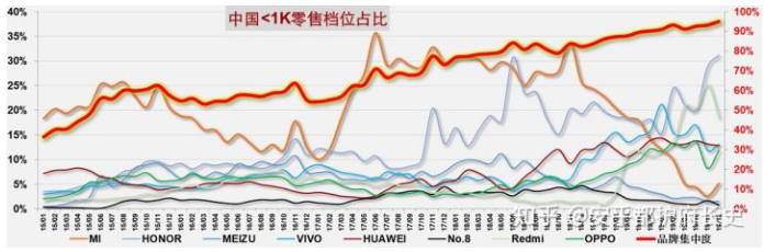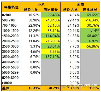 在知乎网友“安乎都护府长史”2018年发布的《中国手机市场零售档位情况》中,就有小米和荣耀的明显对比。