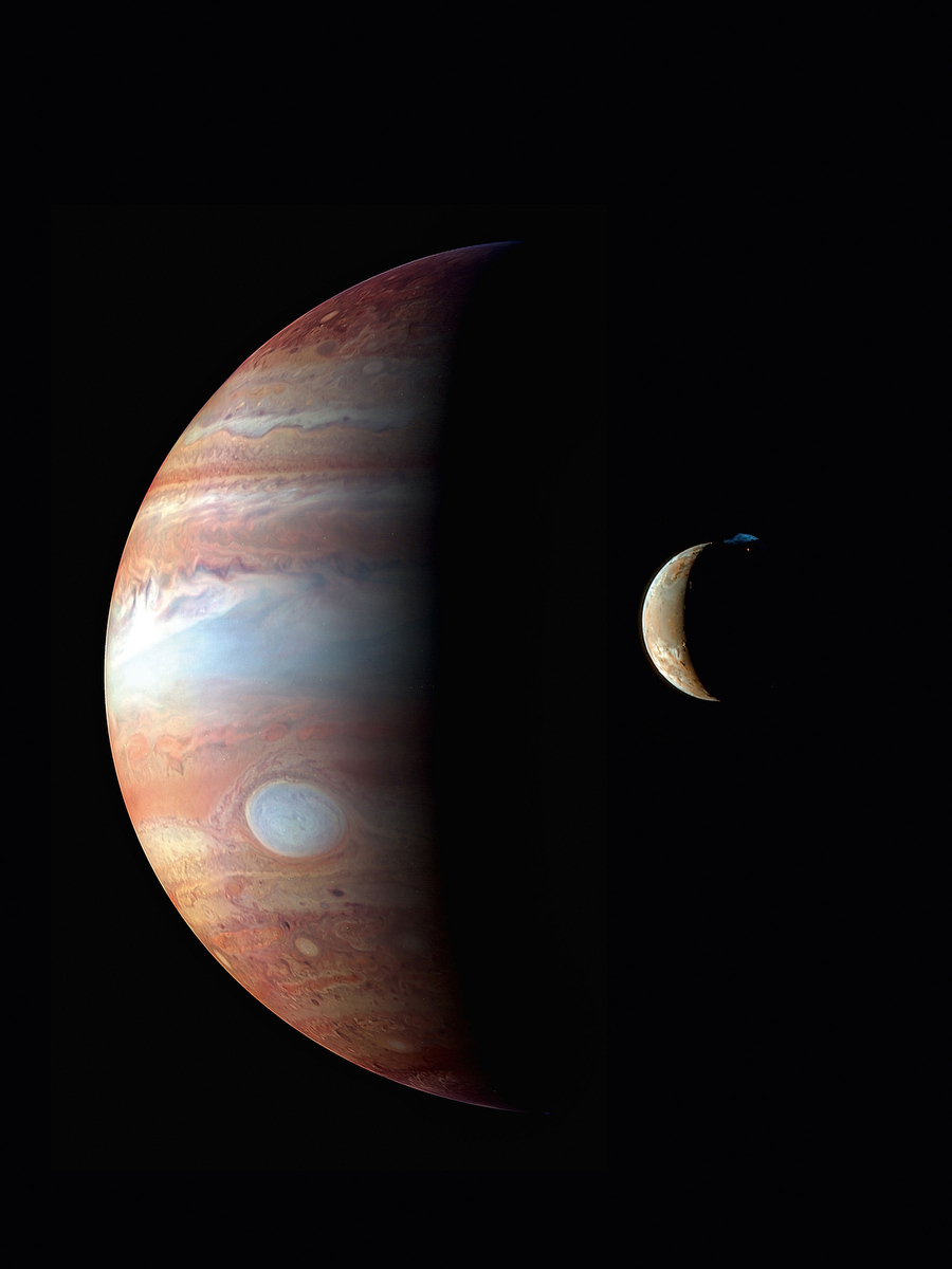 而图片里木星的卫星是一个真色合成图,这张图片显示出在这颗叫做Tvashtar的卫星右侧,有火山多次喷发的迹象。这颗卫星上的潮汐力(受木二卫和木卫三的万有引力作用)使得其成为太阳系火山喷发最活跃的星球,火山喷发的高度能到达距离这颗卫星表面190英里(300千米)的高度。